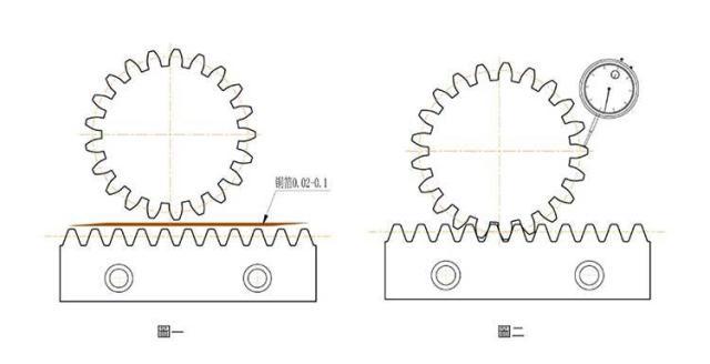 方法1、如圖一齒輪和齒條咬合時放入我們所需的間隙厚度的銅箔片,例如0.02mm厚度的銅箔片,在給齒輪一定的預壓力,使得齒輪和齒條的壓緊,再推動齒輪轉過銅箔片,最終我們得到的間隙是0.02mm左右。
